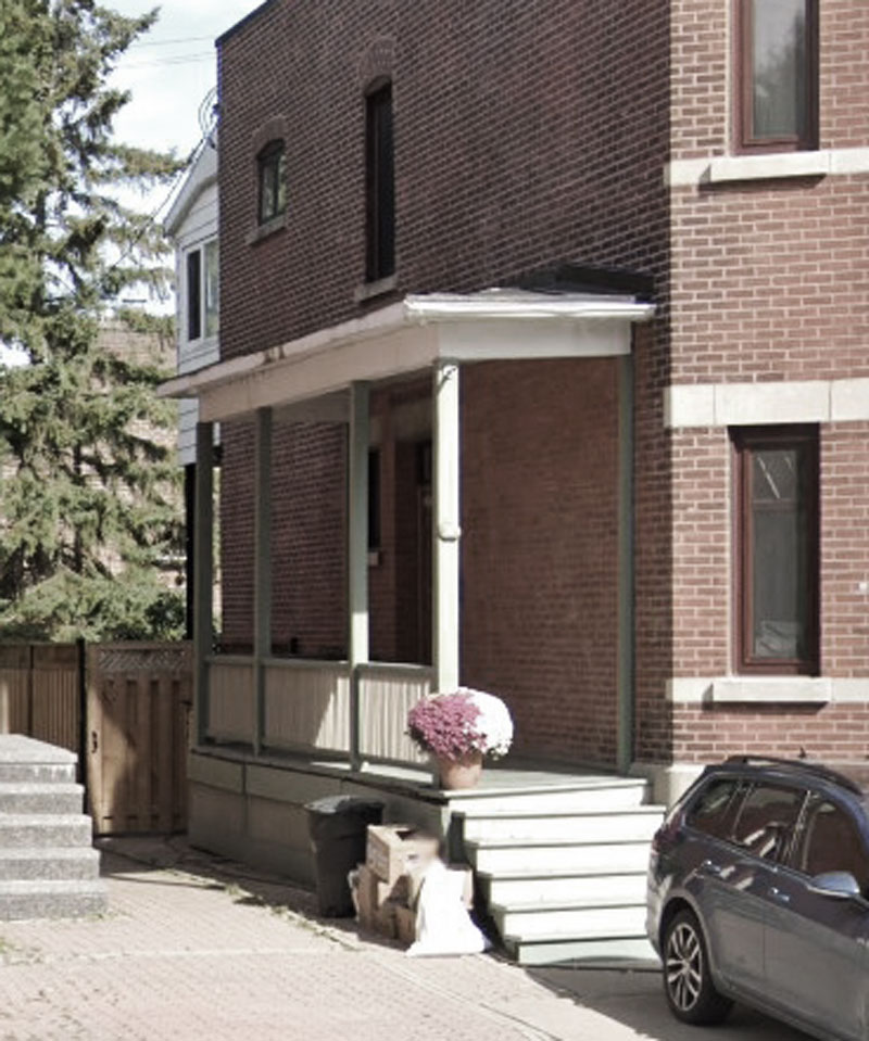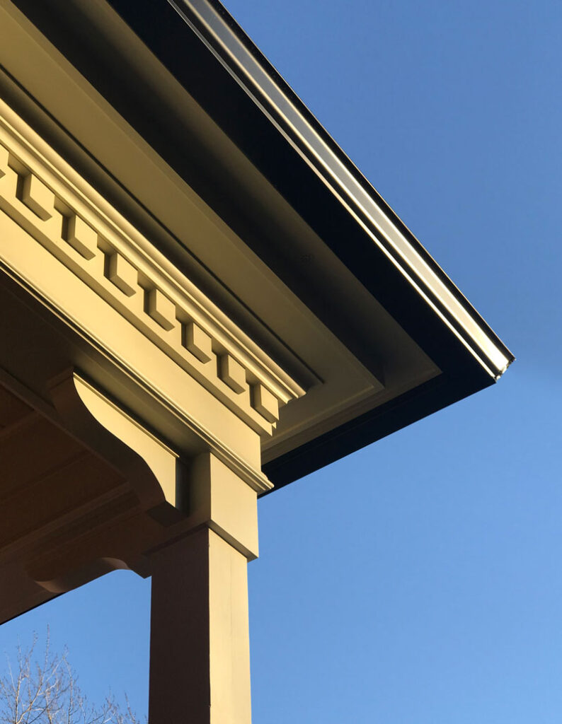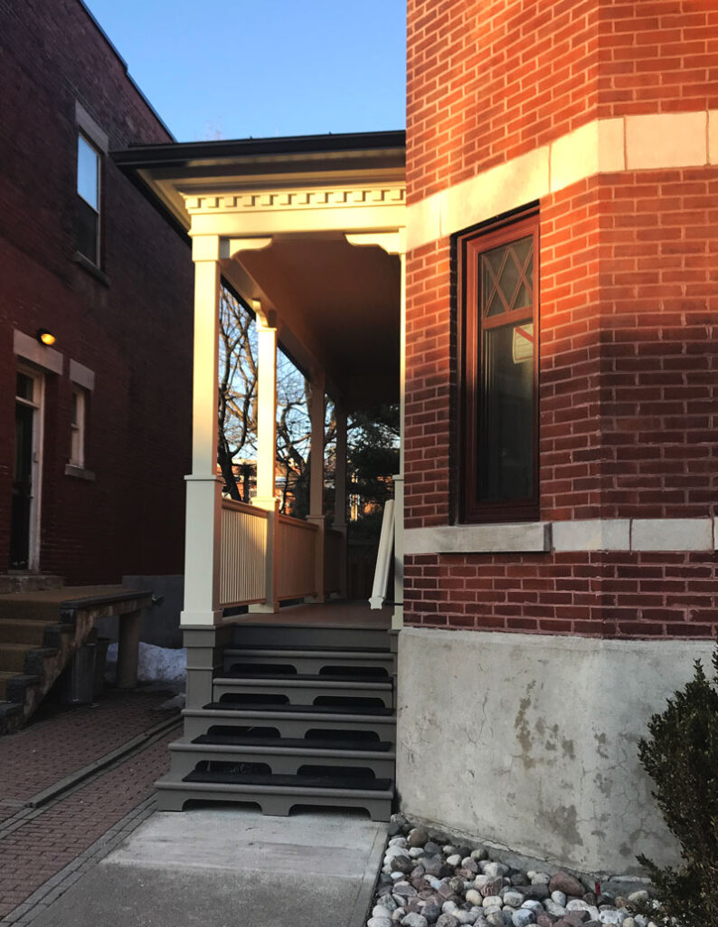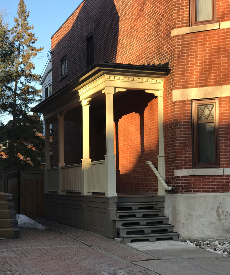 Résidence de Catégorie 2 à Westmount : rénovation du balcon latéral en bois en conservant une partie de la structure saine et le toit en métal à joints pincés. Retour aux détails d’origine et à la coloration historique
